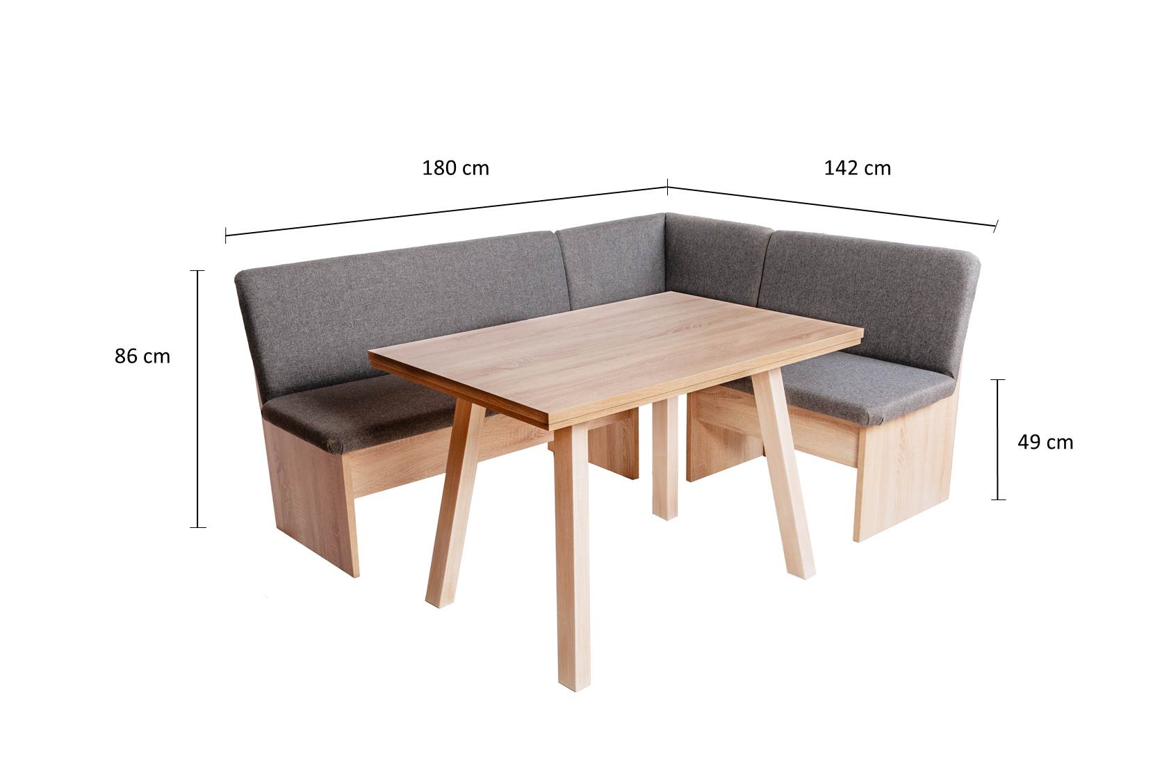 - Tischfüße aus Massivholz. Sitzbänke und Tischplatte Eiche Premiumdekor 2,5 cm Stärke.