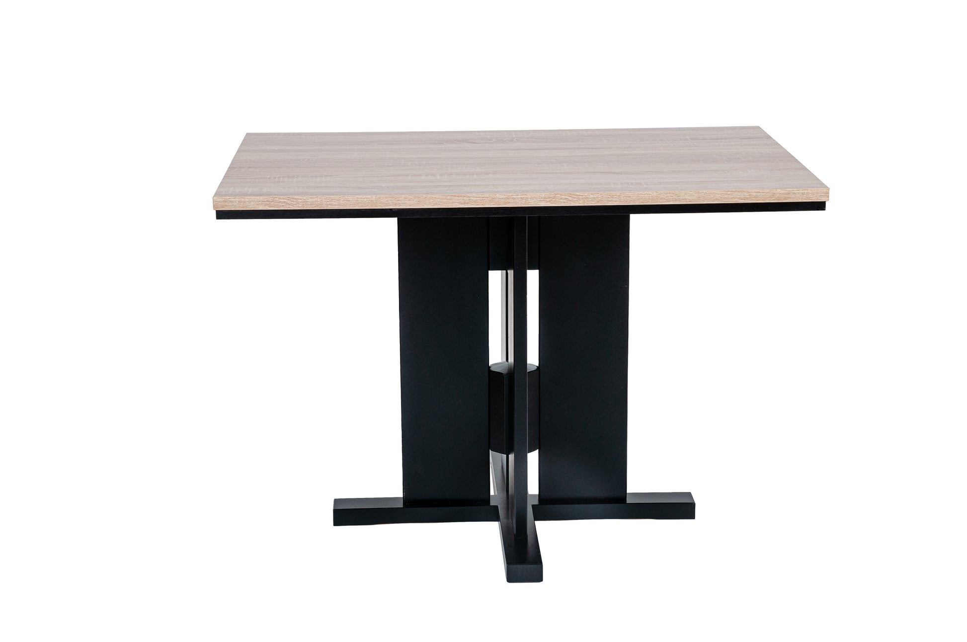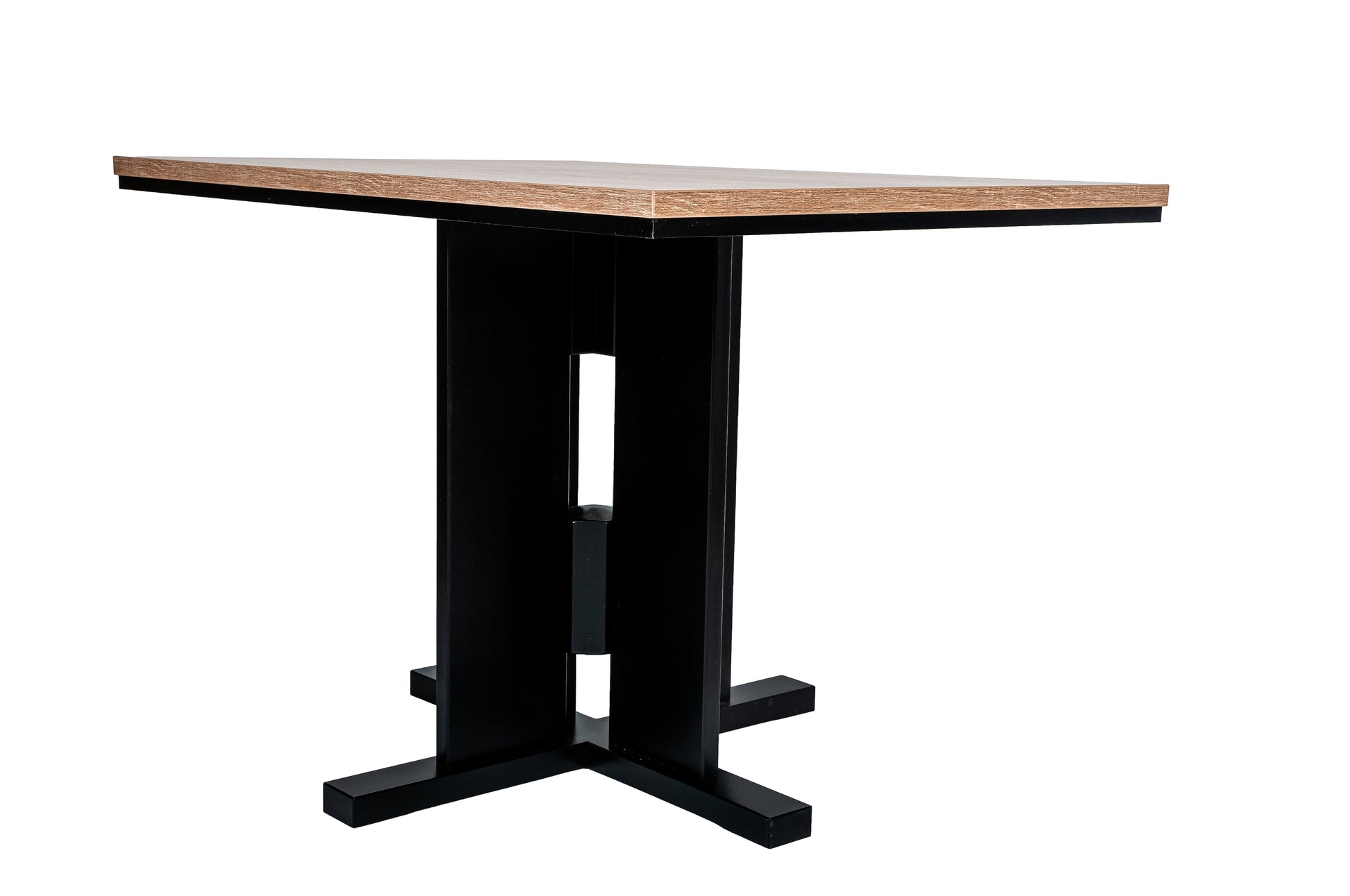 Der Tisch 'Der Schicke' sorgt durch sein Fußgestell für optimale Stabilität, Komfort und Beinfreiheit. Die Tischplatte ist aus pflegeleichtem Premiumdekor in Eiche Optik gefertigt und mit einer sicheren, 2 mm ABS Kante umrandet.