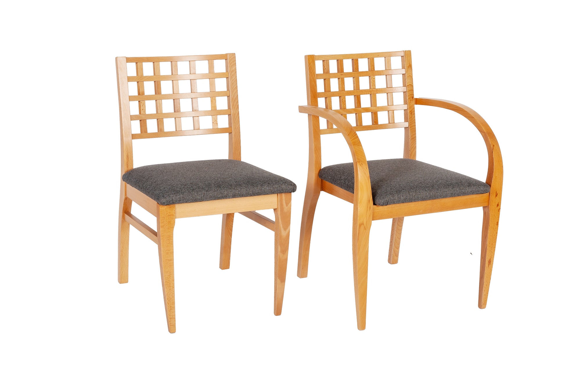 - Gestell aus Massivholz. Sitz gepolstert.1x mit und 1x ohne Armlehne.
